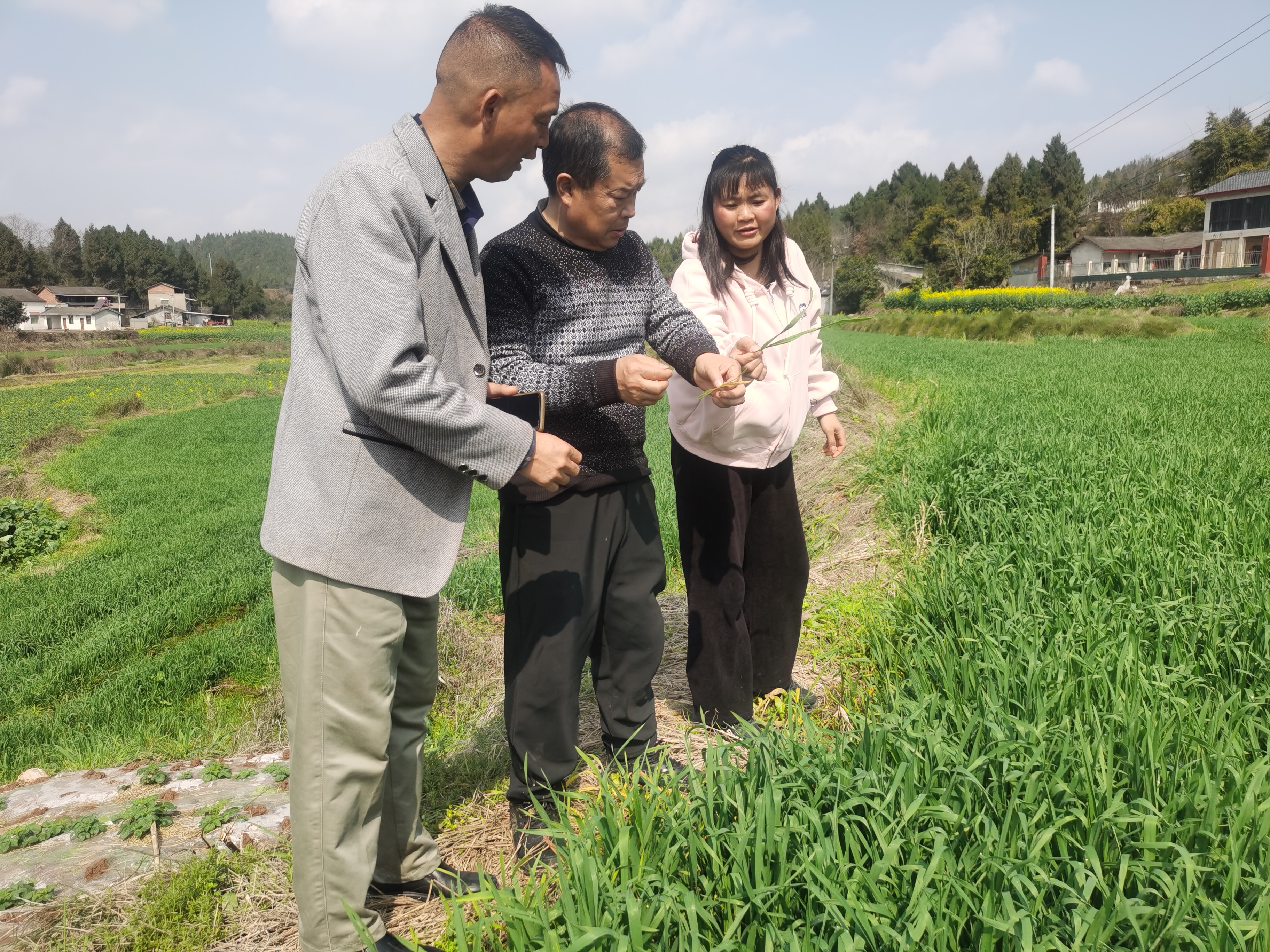 田间回访解难题,技术落地见实效。在师公庙村的小麦种植区,邓其明俯身拨开麦苗,仔细检查土壤墒情和苗情,结合近期倒春寒天气,现场示范防冻保苗技术。“开沟排湿要彻底,叶面肥喷洒需及时”,他将复杂的技术要领编成顺口溜,让农户听得懂、记得住。光明村育苗大棚内,针对新引进的玉米品种出苗不佳问题,邓其明不仅开出“药方”,更牵线对接农科院专家,为产业升级提供长期支持。