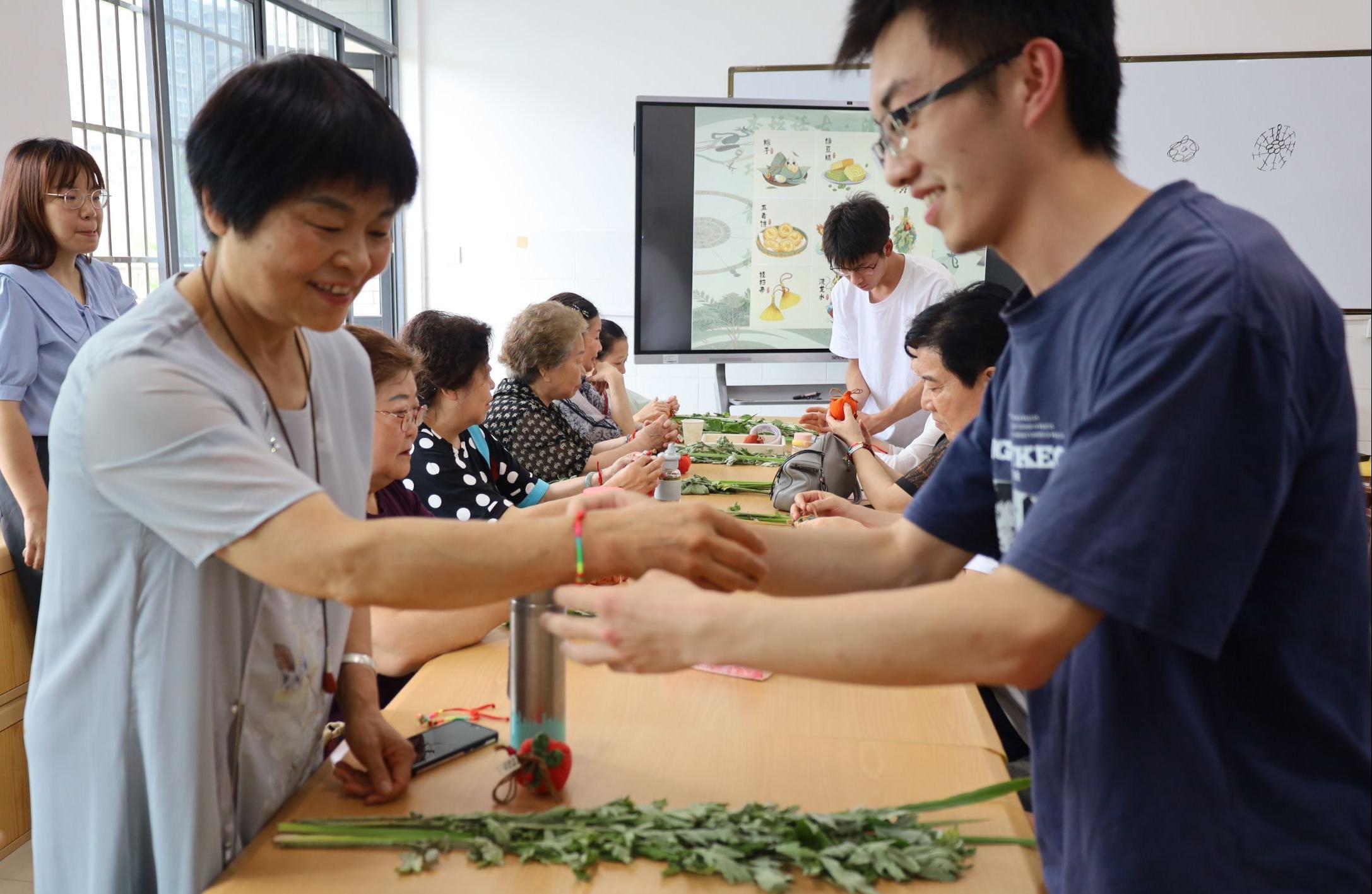 活动过程中,关工委“五老”代表携手青年学子,将传统节日习俗与中医文化巧妙融合,谱写出一曲文化传承与创新的节日华章。离退休教师向青年学子介绍端午节的历史渊源以及佩戴香囊的传统习俗;药学院教师带领学生到野外开展采艾草活动;中医学院教师到活动现场讲解青蒿、陈艾、菖蒲等中草药的用法;针灸推拿学院教师带领学生为离退休教职工提供艾灸和推拿按摩服务。在老师的指导下,学生们分组缝制中药香囊,交流中医配伍智慧,从选择药材、搭配比例到包裹缝制,每一步都有知识和技能,每一个环节都充满了乐趣。大家还一起参与了射五毒立牌活动,祛除病邪,护佑安康。最后,学生为离退休老师佩戴五彩绳,寓意祈福安康;离退休教师回赠彩绳,寄语学子传承医者初心。