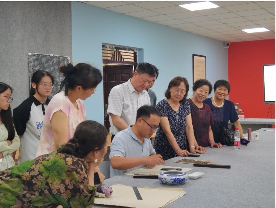 在示范交流环节,掀起本次培训活动高潮。校书法社团学生携带习作前来求教,与"五老"们展开跨代际切磋。老同志们仔细端详后,从用墨浓淡、结构疏密等方面给予点评,并示范如何通过牵丝映带增强字势连贯。他们不仅展示了扎实的书法功底,还耐心地向青年学子们交流学习心得、书写技巧及背后的文化内涵。他们那种活到老、学到老的进取的精神和一丝不苟的学习态度给青年学子们树立了很好的榜样,不忘教育初心,传承中华优秀传统文化,立德树人。