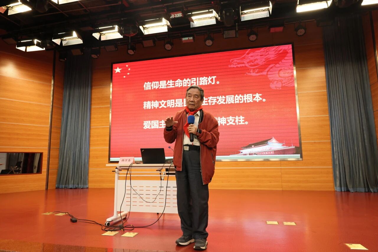 报告中,韩万斋教授结合自身数十年对国歌的研究成果,从历史渊源、音乐专业、精神内涵三个角度展开分享。他回溯《义勇军进行曲》诞生于民族危亡之际的峥嵘岁月,解析旋律中蕴含的不屈斗志与团结力量,讲述歌词背后无数先烈“不愿做奴隶”的抗争故事;同时结合自身专业,以通俗的语言解读国歌的音乐结构与艺术特色,让师生们既读懂历史又感知艺术。现场氛围热烈,韩教授还带领全场师生齐声高唱国歌,激昂的旋律与真挚的情感交织,让每一位参与者深切感受到家国情怀的厚重力量。活动开场前,赵登禹学校学生代表为韩万斋教授佩戴红领巾,以少先队员特有的礼仪,向深耕国歌宣讲数十年的老艺术家致以崇高敬意。